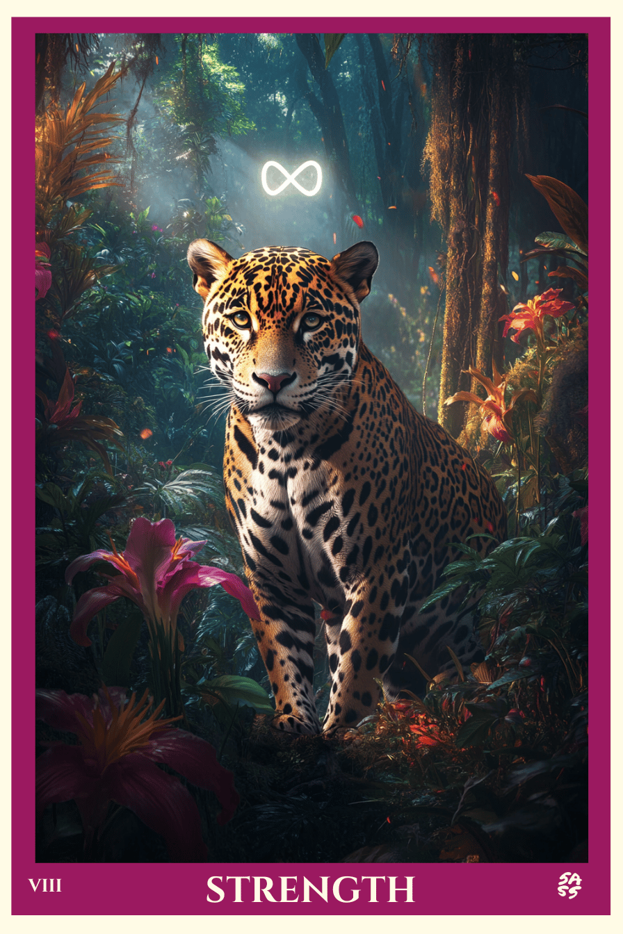 On our card, a young jaguar stands calm and steady in the wild, lush jungle beneath a sky brushed with soft light. Above its head, an infinity symbol glows, reminding us of the boundless well of patience, strength, and heart-centered power within. Vivid orchids and passionflowers bloom at its feet, symbols of growth and the beauty found in vulnerability.