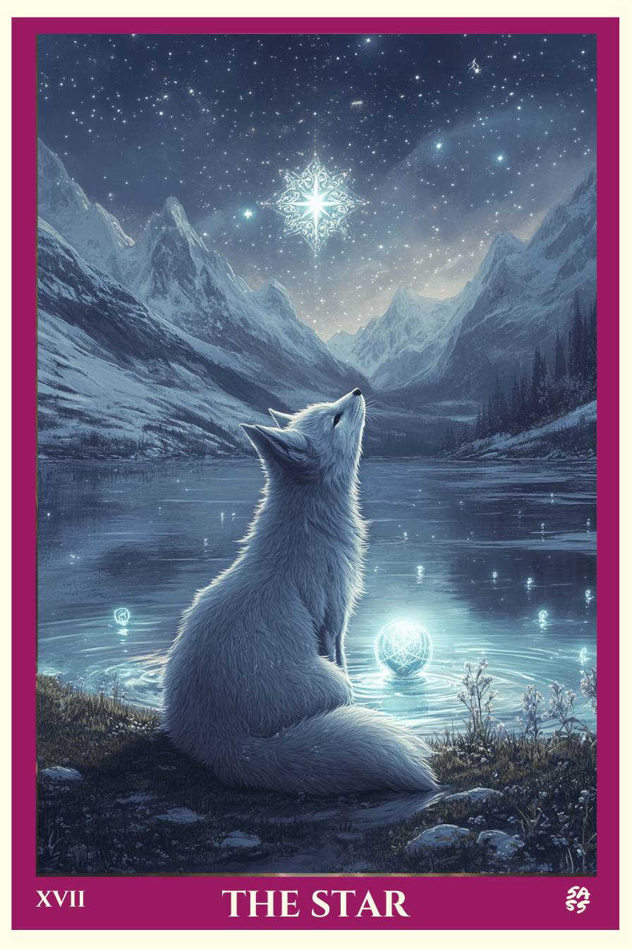 On our card, a luminous arctic fox sits by a still alpine lake. Above its head, a brilliant eight-pointed star glows with purpose, and on the surface of the lake are seven smaller stars—each one a beacon for your inner alignment. Behind it, snow-capped peaks stretch toward the cosmos, and bioluminescent wildflowers shimmer along the shore. This is restoration in motion.