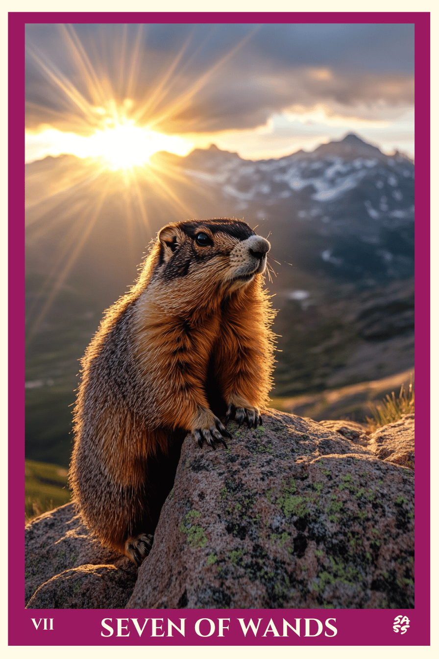 In our SASS Tarot deck, this card features a marmot at the edge of a rocky cliff, standing tall against a sunbeam of light. The mountain has tested the marmot but he’s standing strong.