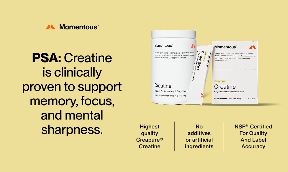Creatine isn’t only about strength—it also supports cognitive performance. Research shows it can help improve mental clarity, quicker recall, and sustained focus during demanding tasks. But not all creatine is equal. Momentous Creapure Creatine Monohydrate is pure, effective, and rigorously tested, trusted by over 200 professional and collegiate teams. Certified by NSF and Informed Sport, it ensures you’re truly maximizing the benefits every scoop delivers.