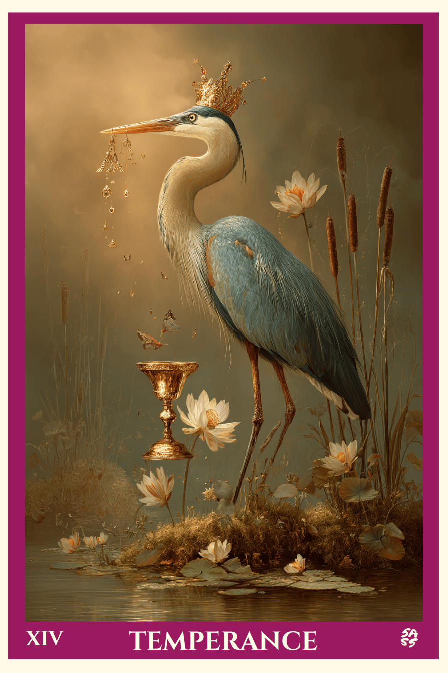 This week’s tarot pull is Temperance, embodied in the quiet grace of a crowned heron balancing on the edge of land and water. One foot rests in the shimmering pond, the other on solid earth, as a chalice hovers delicately in the air, receiving light and wisdom from the crowned heron.
